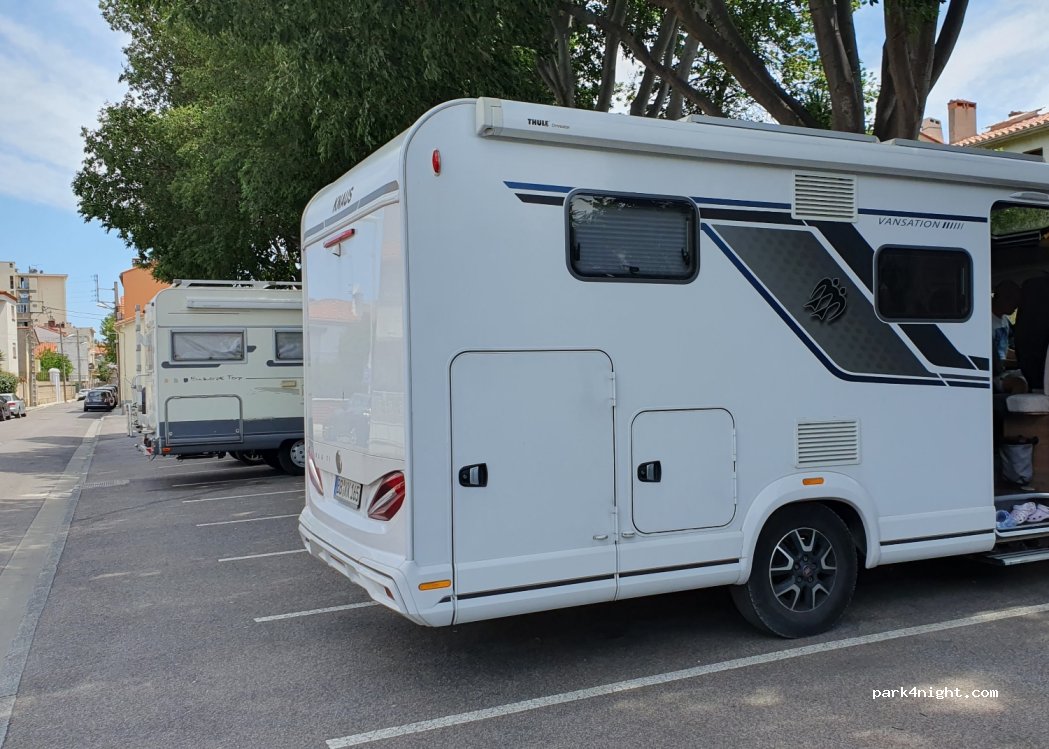 Schattiger, ruhiger Parkplatz von dem aus man gerade 15min ins Zentrum braucht. Für einen Tagestripp nach perpignan perfekt!! Am Ende der Straße stehen auch zwei Container zu Müllentsorgung.