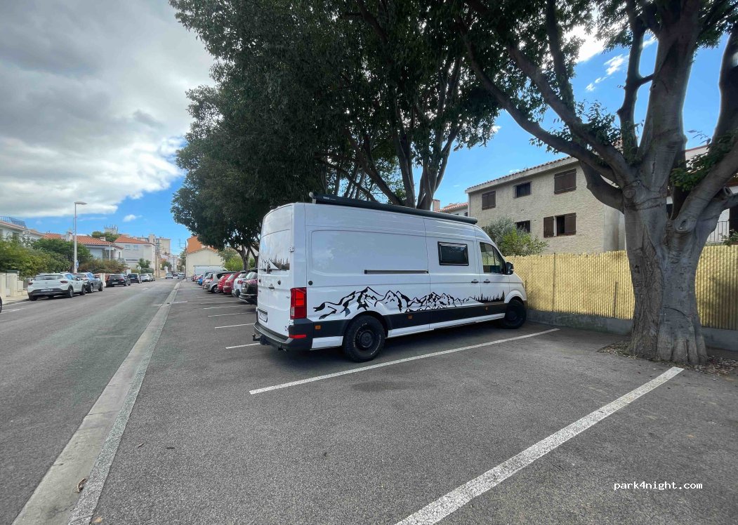 Ce parking est situé dans une zone résidentielle calme. Nous nous y sommes garés pour visiter le centre ville de Perpignan. Aucun problème pour y caser notre fourgon de 6m sans dépasser des places de parking. Par contre quand nous partions un gros gabarits venait de se garer en prenant 6 places. Merci de respecter le voisinage et ces rares places que nous pouvons utiliser...