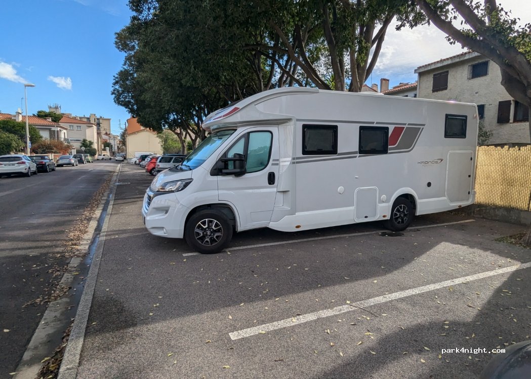 We tried the other car park but it was full. There were several spaces free here. Quiet residential street and spaces long and almost level. Parked while we went into Perpignan for lunch but moved on.
