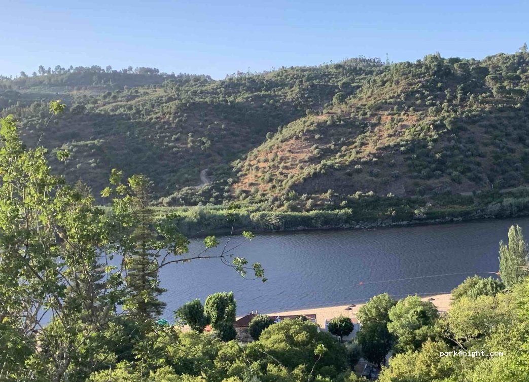 Good gravel P for the river beach and overnight, 150 m away from ALAMAL beach on Tejo river. Do not drive to beach itself once it is forbidden to motorhomes and other big vehicles. The final stretch of the paved road is somewhat narrow, winding and descending, but the location justifies access! Panoramic swing on middle of descent. Bar-resto on beach building as well as toilets. PR1 hiking trail along riverside (there’s info panel). The train goes on the other bank but not disturbing. 4G full bar.