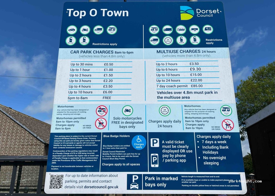 Top O Town Car et Coach Park. Peut-être le seul parking de Dorchester où les camping-cars ne sont pas spécifiquement interdits.