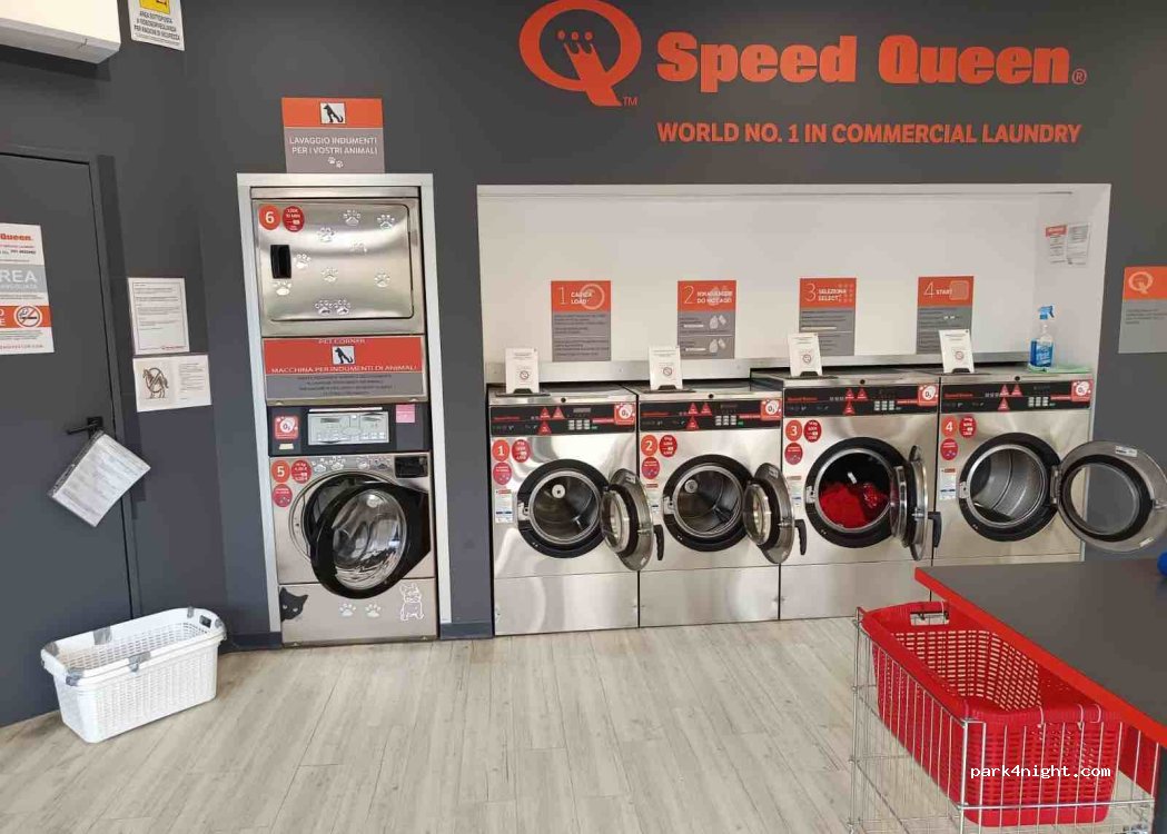 Speed queen brand coin laundry. If cannot park opposite then possible to park under nearby Strada Regionale 14 road bridge 200M away.