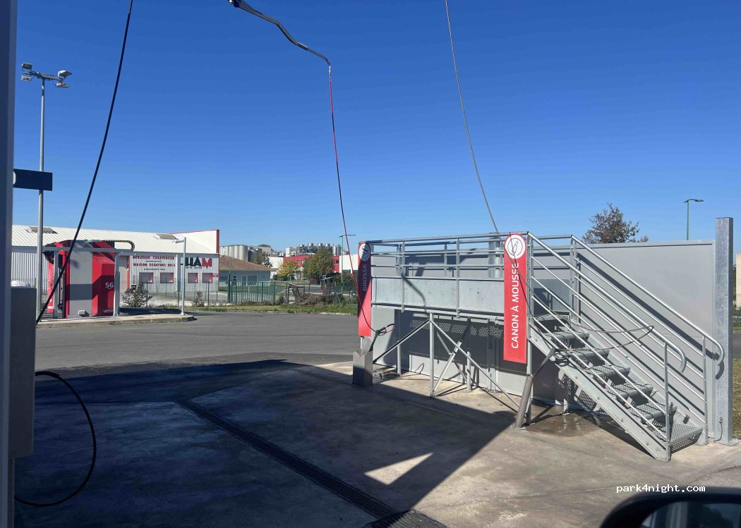 excellent place to stop. fantastic facilities provided by the supermarket intermarche. safe to park. black water, grey water, and drinking water available. a chance to stock your fridge. laundry available. fuel availability. and best of all for me, a chance to clean the motorhome, roof and all. As a gantry is provided at the pressure washer. clean with the broom and rinse on low pressure.