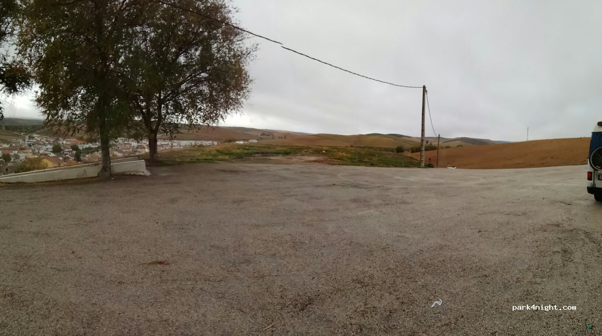 Right next to a cemetery. very peaceful, no traffic at all. no services, no signs that parking is not allowed. perfect. N.B. the asphalted area is a helicopter landing spot so take care to park on the grass or (if you have a small vehicle) right up close to the wall.