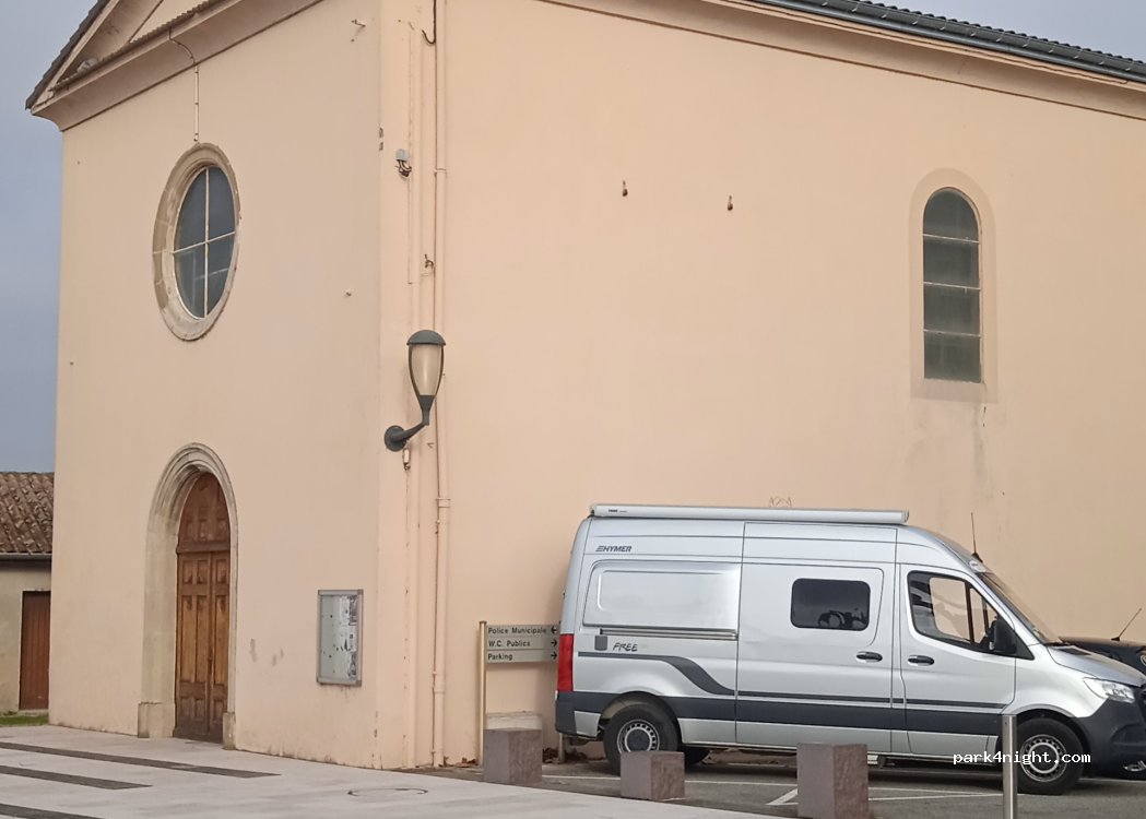 Parking derrière la mairie. Quartier assez calme avec un petit square et des arbres.