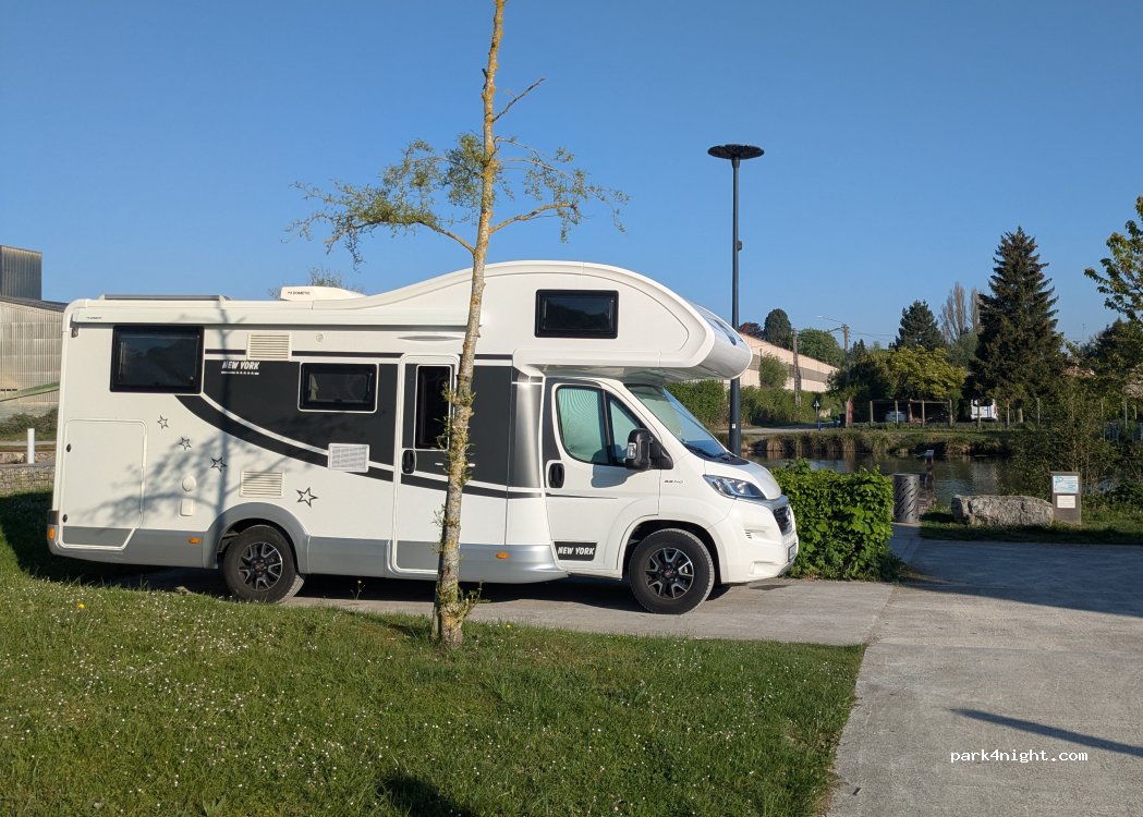 Très jolie aire à côté du canal. Par contre, espaces très serrés et pas larges pour manœuvrer avec un 7,5 mètres de long. Aucun service