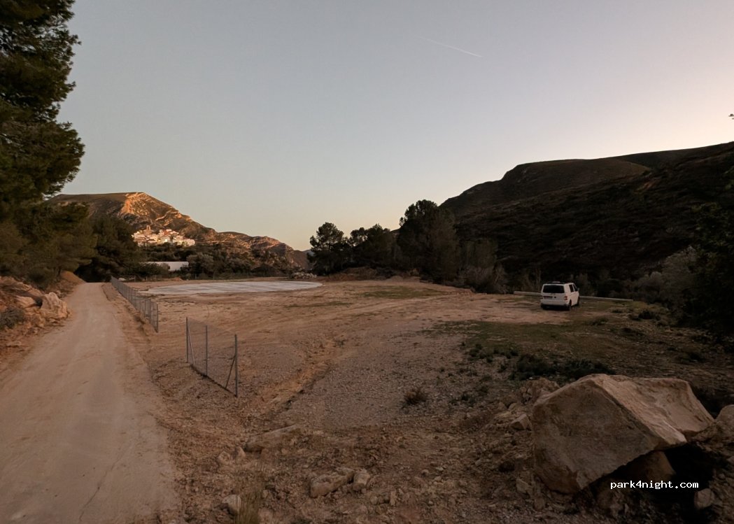 Explanada de tierra bastante nivelada y amplia a las afueras de Dos Aguas. Lugar muy tranquilo para pernoctar pero sin servicios.