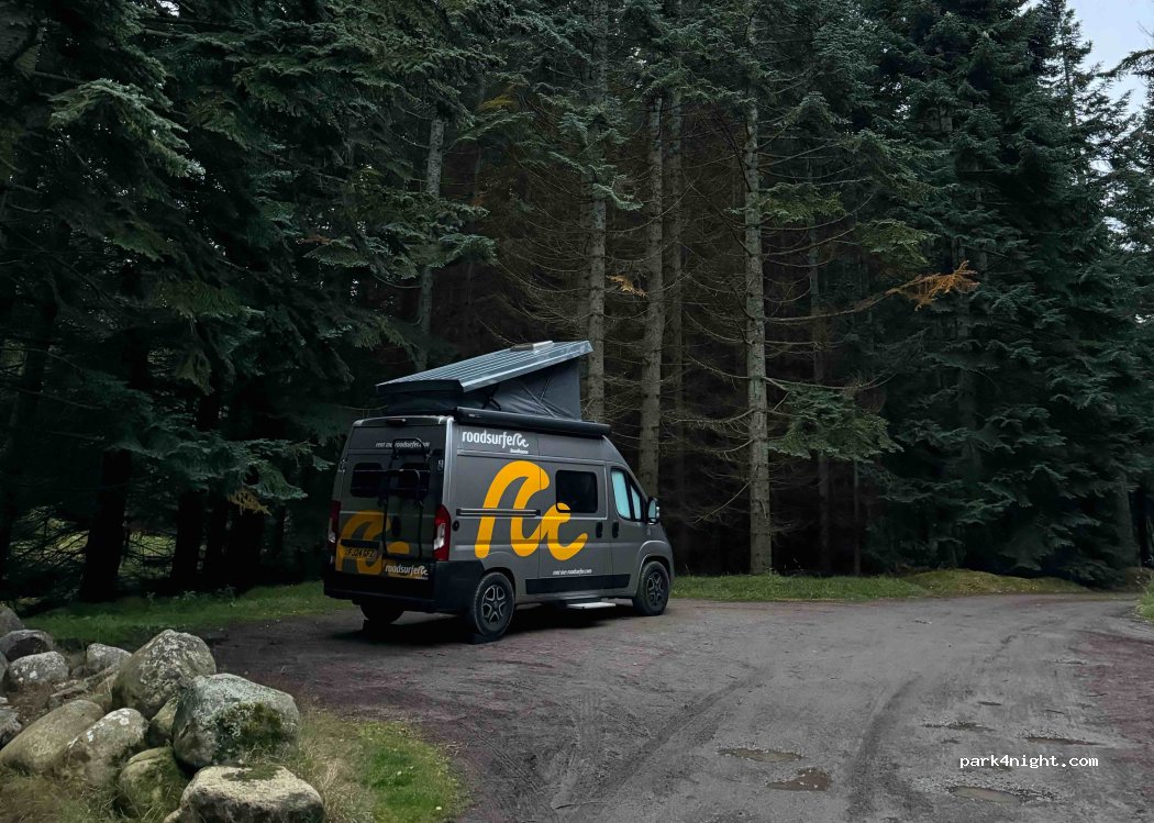 Woodland car park, expensive for what it is. You can still hear the road from here. Access to the trails for walks and mountain bikes. The Dee side way is also directly over the road as you drive in. We had a quiet night only one other van here, parked on the opposite side of the car park. Great area.
