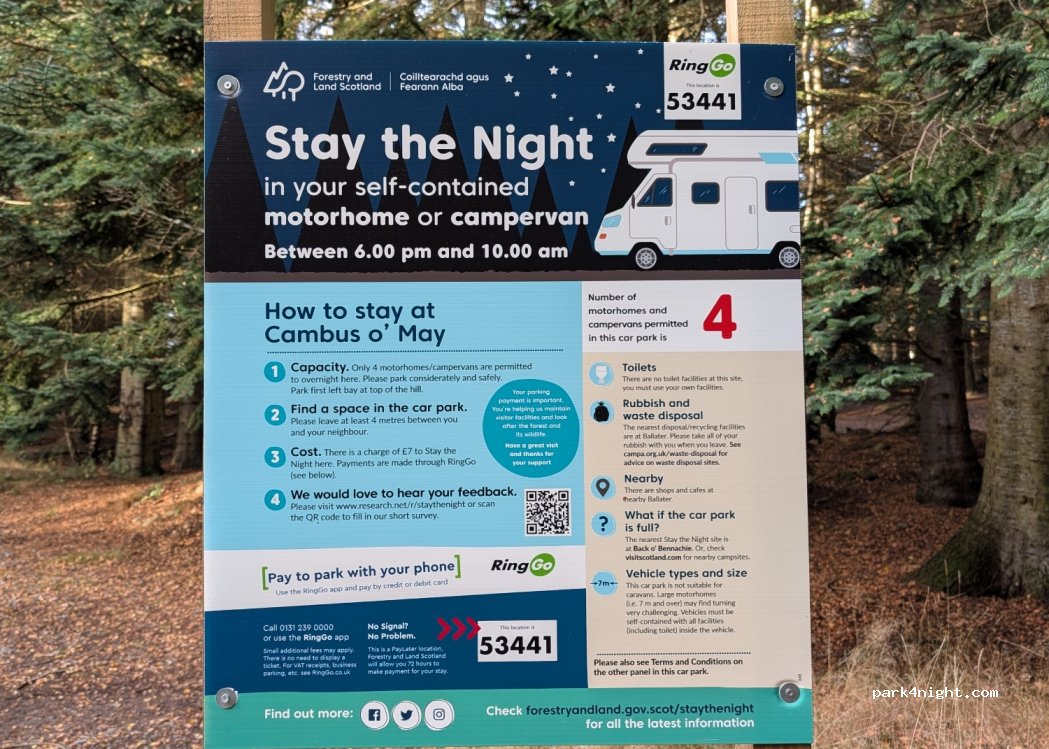 there is an overnight parking for 4 self contained campervans. no fires. no barbecue. £7.40 via an app. no pre booking.