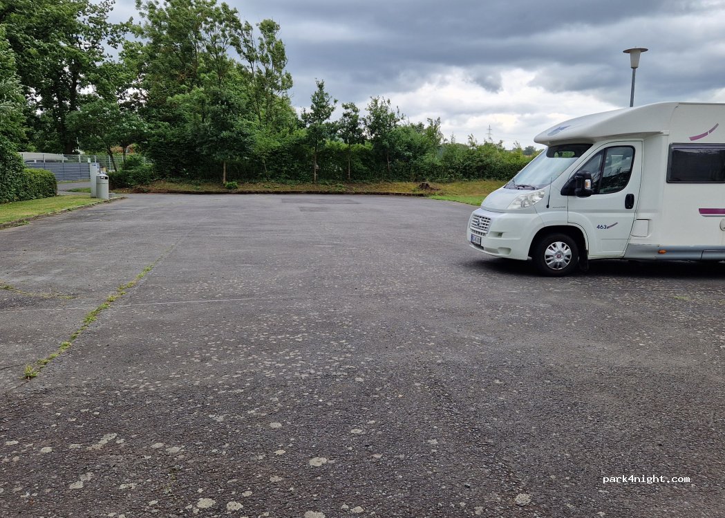A simple place, parking on asphalt, view to sun set and sound of lark song over the fields, otherwise quiet, besides low voices from nearby camping area. Quiet at night. A sign tells 8 euro for overnight stay. Another sign tells paying should be made at the camping area reception. The camping area receptionist claimed 10 euros. Strange. See comment made to the camping area.