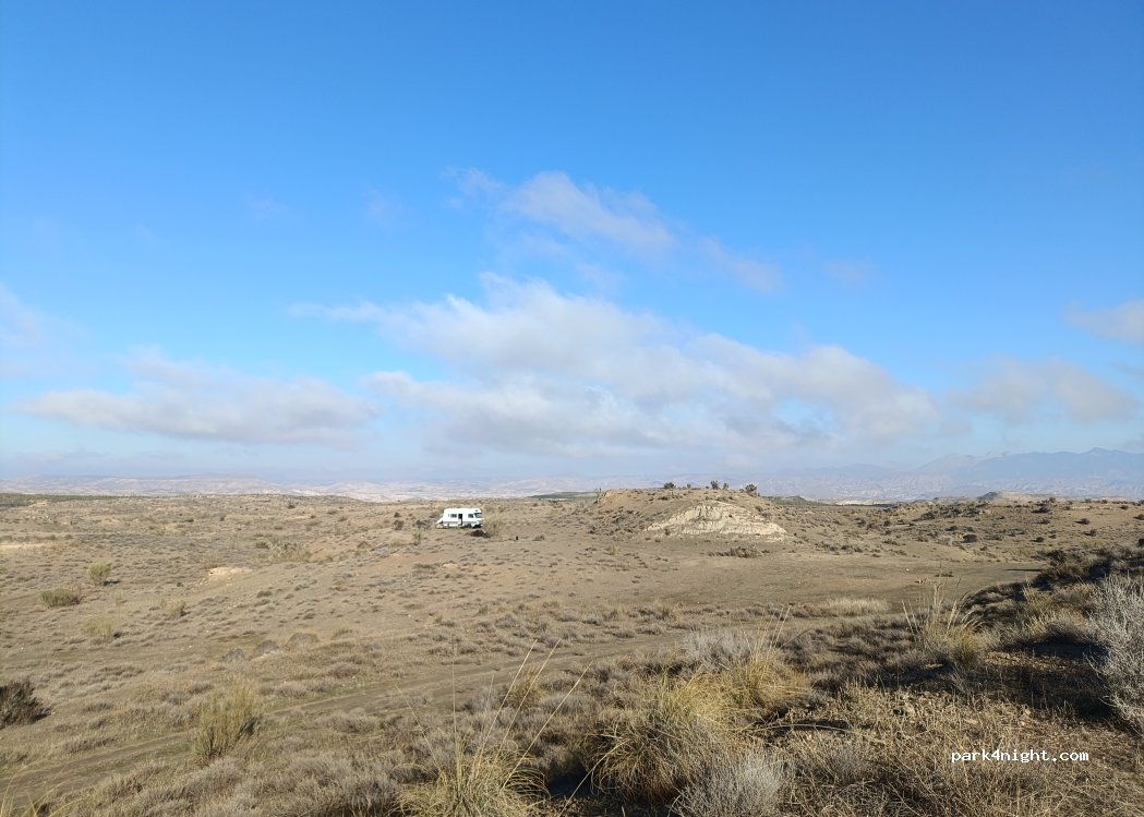 Near main "road" but protected by a little hill with a tunnel/old cave. There is a sign that forbids access with motorhomes from Gorafe.