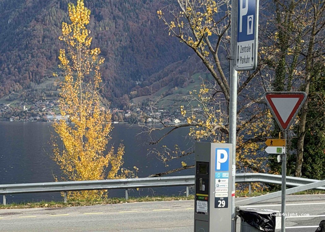 Schöne Aussicht mit Blick auf See und Berge. Ab 1.11. scheinbar kostenlos. Zumindest laut dem Schild auf der Parkuhr. Züge fahren recht regelmäßig, aber ob es wirklich störend ist hängt von der Lärmempfindlichkeit ab. Auf der Parkuhr steht eine maximale Parkdauer von 12h aber ohne Ticket schwer zu kontrollieren.