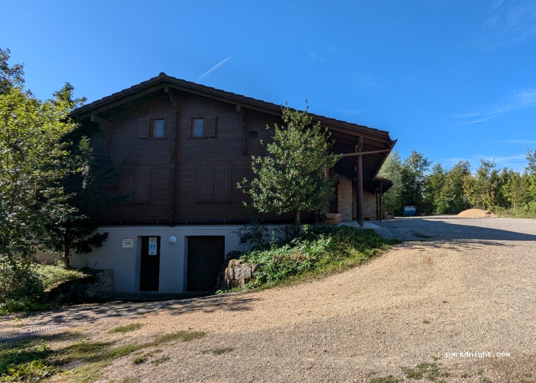 Parking en graviers le long d’une route peu fréquentée, avec des départs de randonnées dans la forêt. Il y a un chalet accessible via un court sentier, avec des toilettes très propres (ouvertes de 9h à 21h), une zone pour faire des barbecues, et une très belle vue sur Bâle ! La circulation s’arrête vers 23h. Parfait pour une nuit !