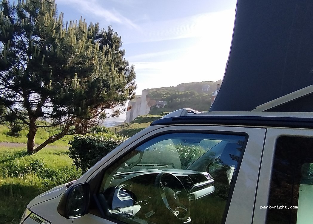 Superbe vue sur la mer, mais concernant le parking du haut: barre limitant la hauteur à 2 mètres.. Quant au petit parking en bas des falaises, arrêté municipal de Octobre 2021 interdisant le stationnement.