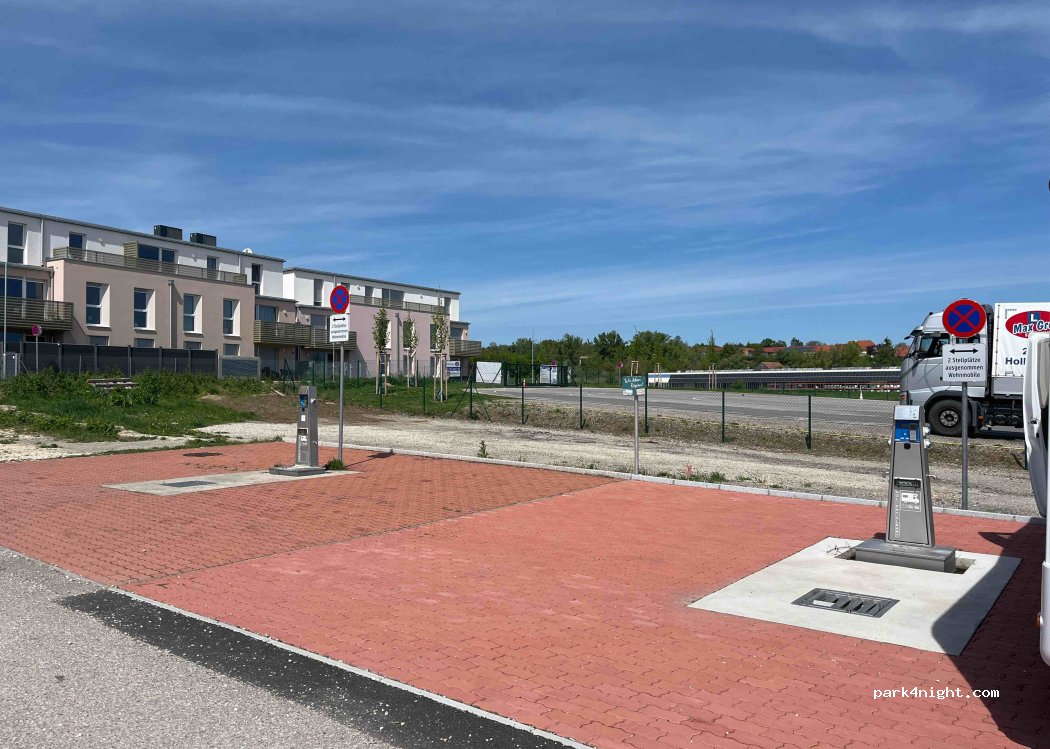 Grandissimo parcheggio dove scaricare acque grigie e nere gratuitamente, e caricare acqua potabile, ora 50ct x 5 minuti: ho caricato 200 litri e ancora non era finito il tempo. Posto tranquillissimo, ci abbiamo passato la notte. Nelle vicinanze McDonald's, Billa, e molto altro in un grande centro commerciale. Stazione del treno a 3 minuti a piedi, per raggiungere Vienna.
