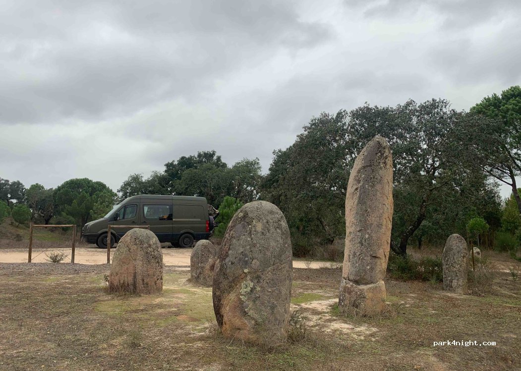 Portugal, Évora district, Alentejo region, somewhere between Mora and Pavia. We could not just pass the signpost to the dolmen of 'Cromeleque das Fontainhas'. The first pictures show why our decision was made quickly, this will be our bedroom for tonight. No service.