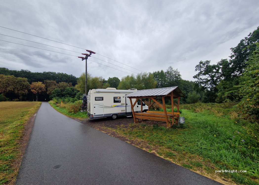Covered picnic area. Also suitable for overnight stays if necessary. about 70 m from the road. View of the field and a little Thuringian forest.