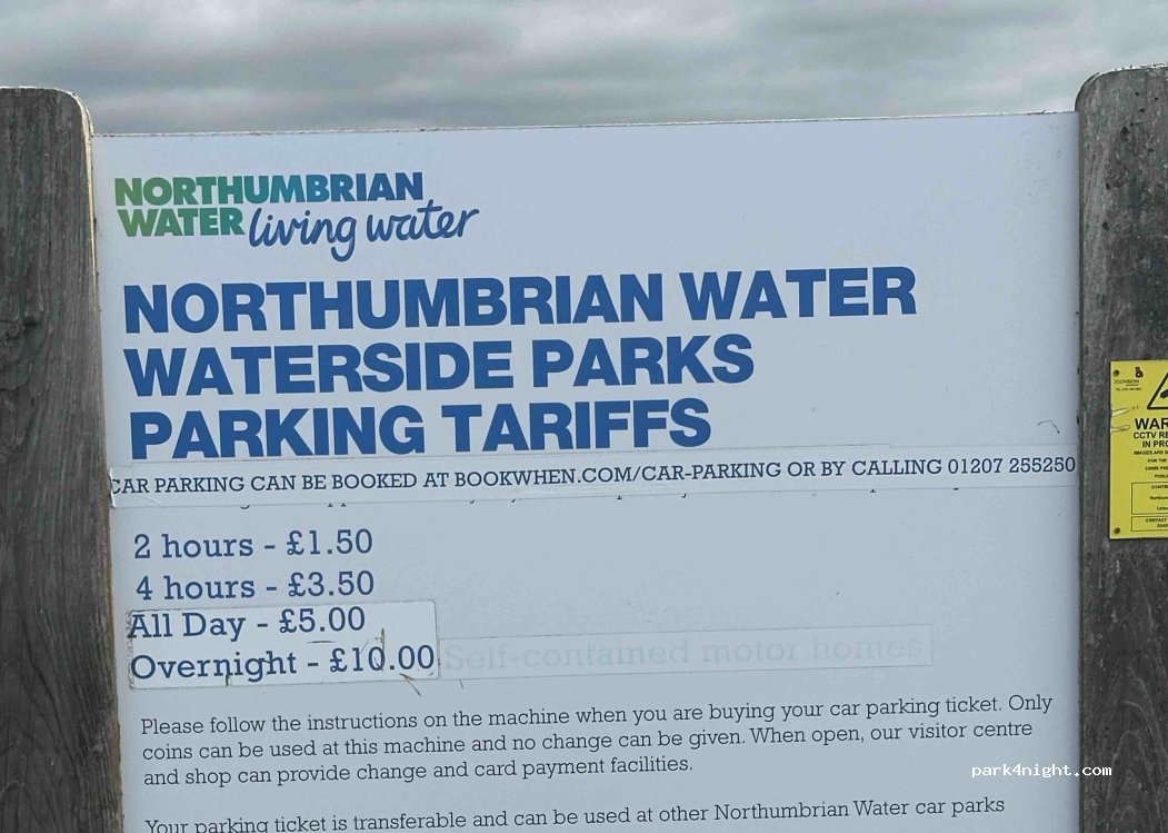 Pay and display car park. Owned by Northumbria water. Charges reasonable per hour or £10 overnight. Toilets. Lovely walk path from car park through woodland around the edge of the reservoir to the visitors centre. Pic nic bench