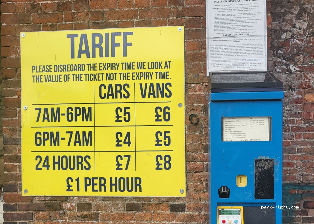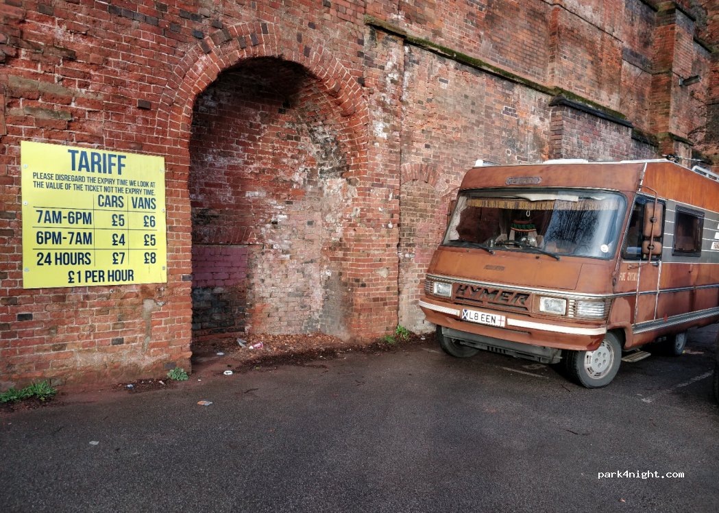 Paid parking 24hours, next to a busy road but being in a city center you don’t have much choice. We paid £8 and stayed fine over night. The price is £1 pretty hour. If you stay 3 hours for example, pay 3. And so on...