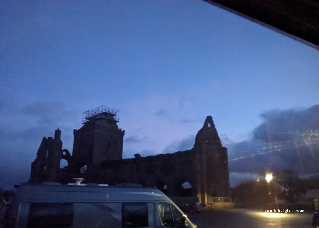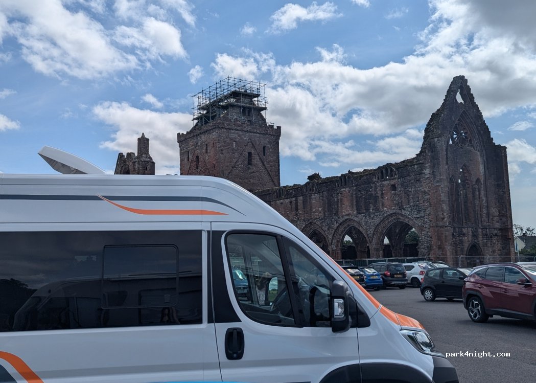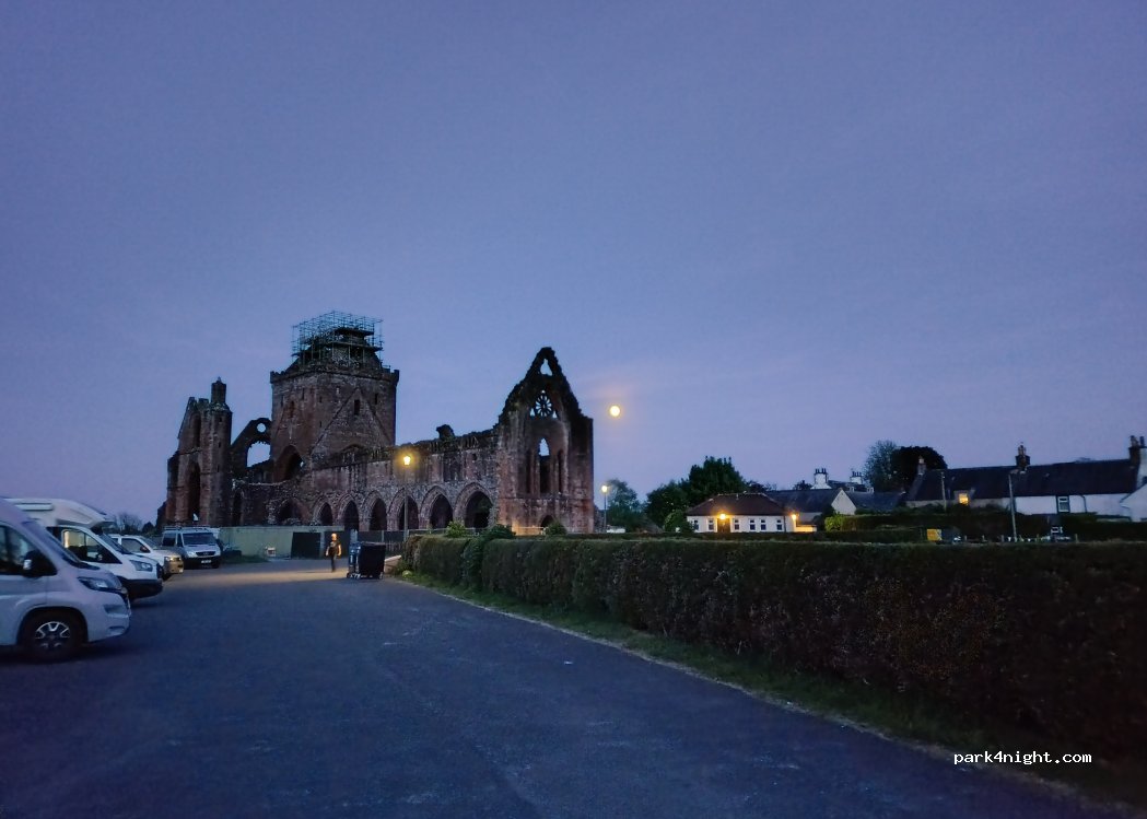 Large flat paved parking lot at the beautiful Sweetheart Abbey ruins. 3 other campers besides us. Very quiet night. Good phone signal.