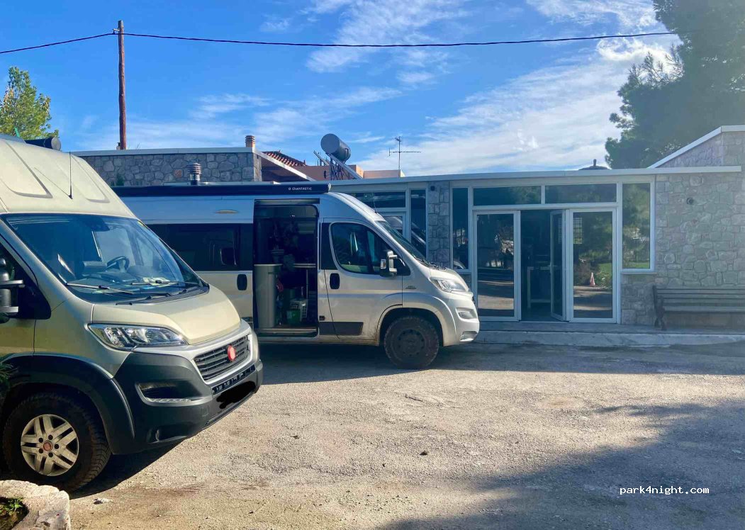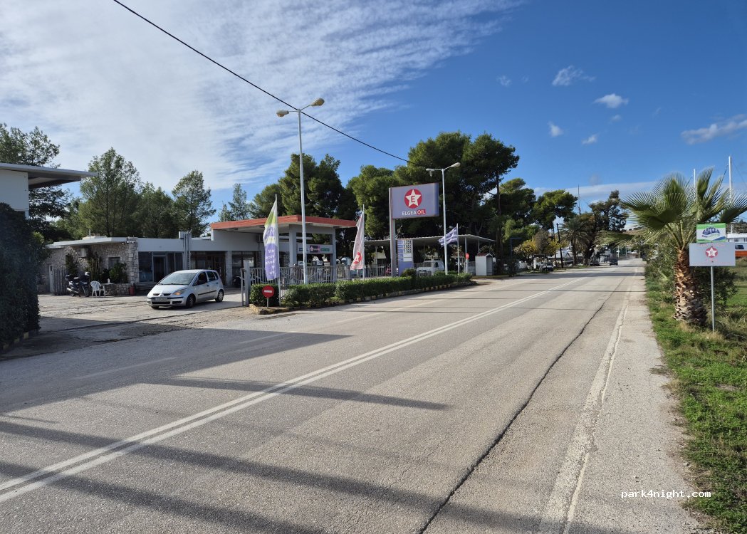 Am Waschsalon gibt es eine Tankstelle und einen Auto-/Mopedverleih. Wir durften mit unserem 9m Wohnmobil neben dem Toilettenhaus schräg gegenüber des Waschsalons parken.