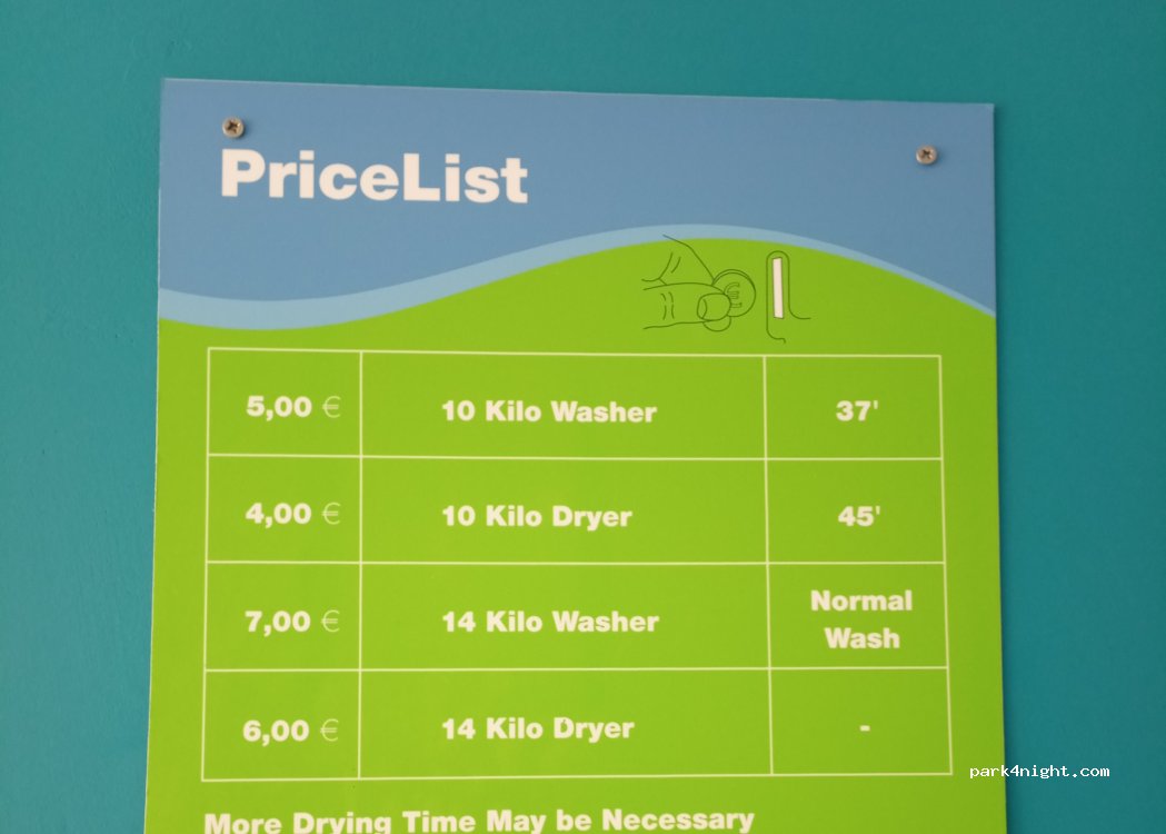 There is plenty of space to park outside. We parked our 9m camper just in front of the landury. 10kg washing €5, 14kg €7 Dryer 10kg €4, 14kg €6 Nice and clean Bring the euro coints with you