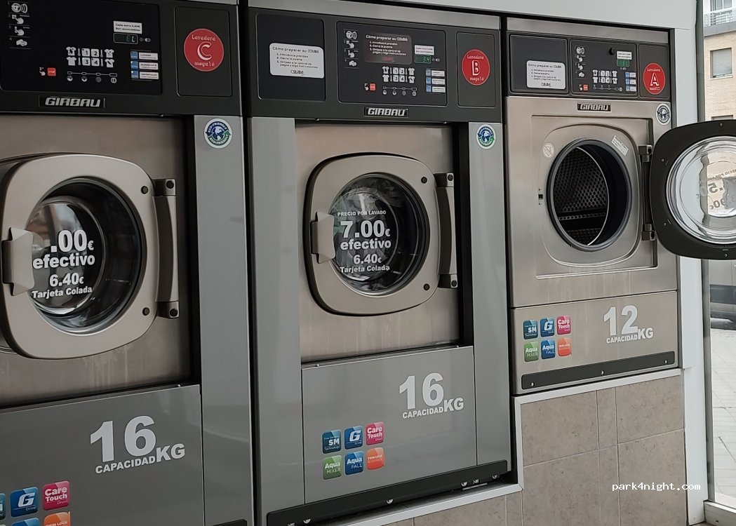 Man kann in der Nebenstraße wunderbar parken. Auch vor der Tür (sind mit Glück) Parkplätze. Der Automat funktioniert nicht, wenn man die Sprache auf Deutsch stellt. Er hat sich aufgehangen. Ich habe dann auf Spanisch das Waschprogramm einstellen und starten können. 7€ waschen, 3,50€ trocknen.