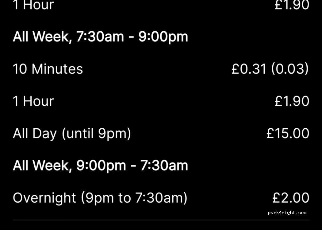 1hr - 1.90 not pay and display car par you need ringgo parking app to park.not free from 9pm till 7am anymore its 2 pound for overnight. Quiet with Iceland supermarket next door and walking distance (15 min) to Canterbury.