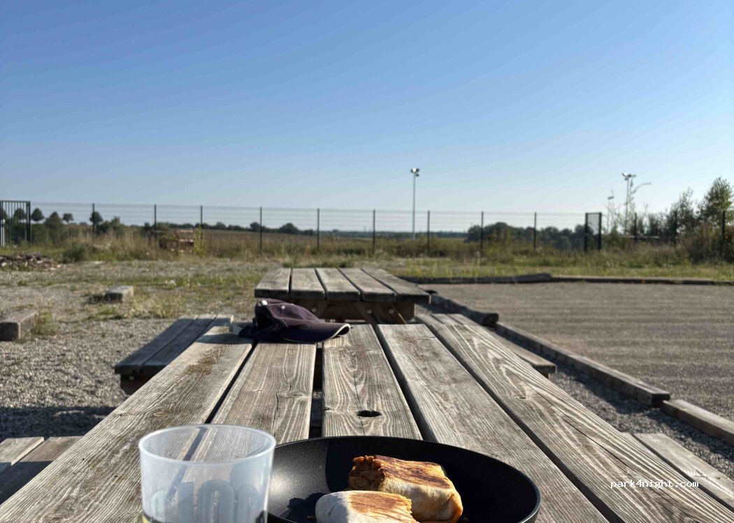 Endroit parfait, très calme pour une soirée et une nuit. Il y a un city à proximité et une grande esplanade si besoin de se défouler. Nous avons testé le snack à quelques mètres qui est très bon avec un très grand choix (pizza, grillades, kebab….)