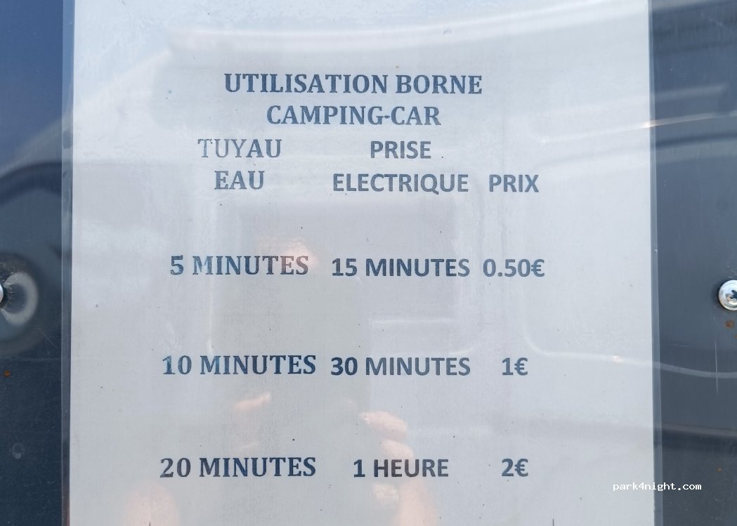 Ns n avons pas utilisé l eau et l électricité mais vider que les eaux usés , fait des courses et avons passé une nuit au calme derrière l entrée du magasin parking suffisamment grand