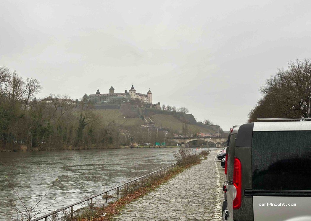 Perfect spot to park directly on the river with a view of the town‘s two landmarks "Käppele" and "Festung Marienberg". Short walk along the the river to the old town. Mind to pick up after yourselves. ;) During the summer months less parking spots are available, as this area is partially being turned into "Stadtstrand" - a pop up beach bar.