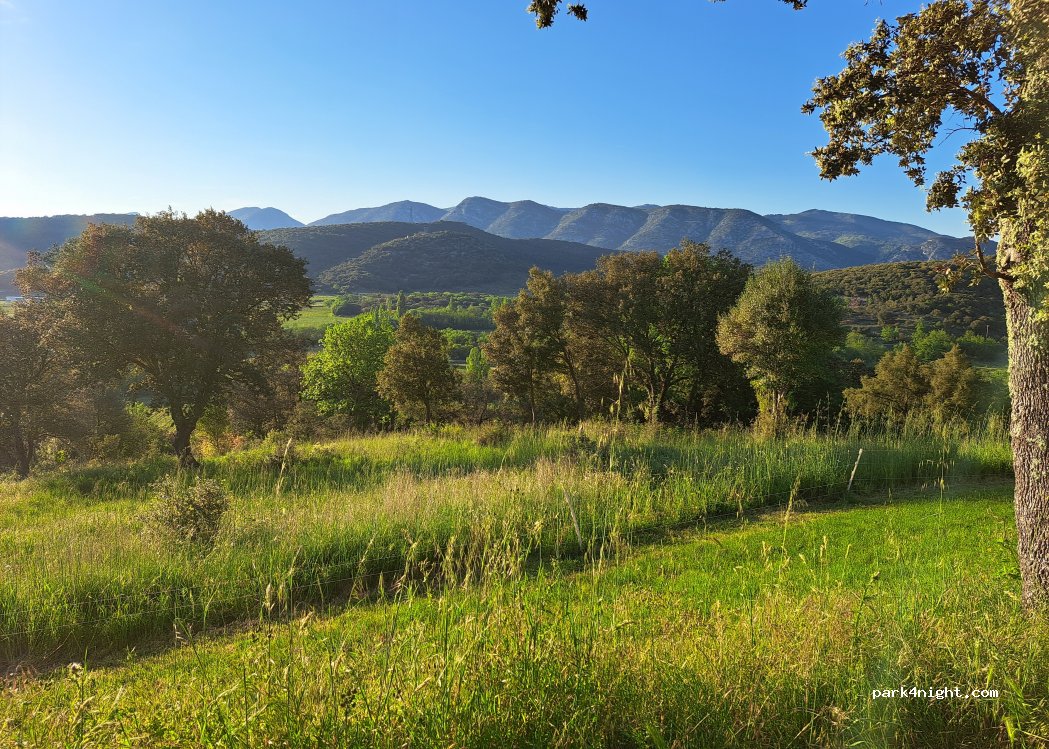 Une vue extraordinaire sur la vallée de Montoulieu et le massif de l Aigoual au loin.accueil très sympathique.site tres calme dans un écrin de verdure préservé au cœur d une propriété de 200hect.agréable piscine à debordement avec pelouse et transats. planchas.sanitaires propres,wc,lave linge,coin vaisselle,freezer,location frigo. conseils pour les ballades.prix très correct.
