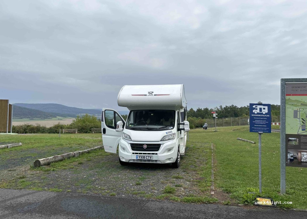 Drei ausgewiesene Stellplätze für Wohnmobile. Parkplatz Point Alpha, Denkmal zur Entwicklung der innerdeutschen Grenze. Wunderschöne Gegend, wunderschöne Aussicht. Absolute Ruhe sobald Museum geschlossen hat. Kein Strom, keine Ver- und Entsorgung möglich.