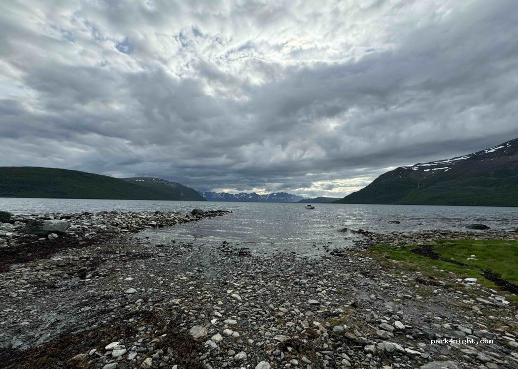 Prima plek voor een nacht op doorreis. Erg mooi uitzicht op het fjord. Je kan zwemmen aan het kiezelstrandje. Ook water tappen en lozen is prima. Er zijn genoeg douches, maar het is wel even zoeken. Al met al prima!