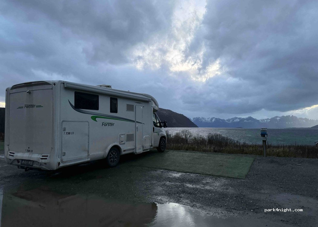 Le paysage, entre mer et montagnes, est magnifique. Nous avons vu des aurores boréales. Même en hiver, l’accès au camping est entretenu et régulièrement déneigé. Bornes en 16 amp. Les hôtes sont vraiment charmants et très attentionnés. Un lieu vraiment rare, où l’on apprécie d’autant plus la chaleur de l’accueil que les jours sont courts et le froid est vif.