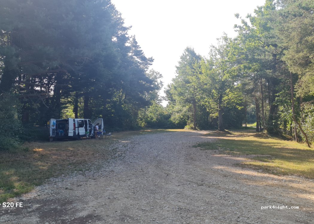 Pretty little pond in the middle of the forest with tables and very quiet shade, no services easy access to any type of HGV vehicle included