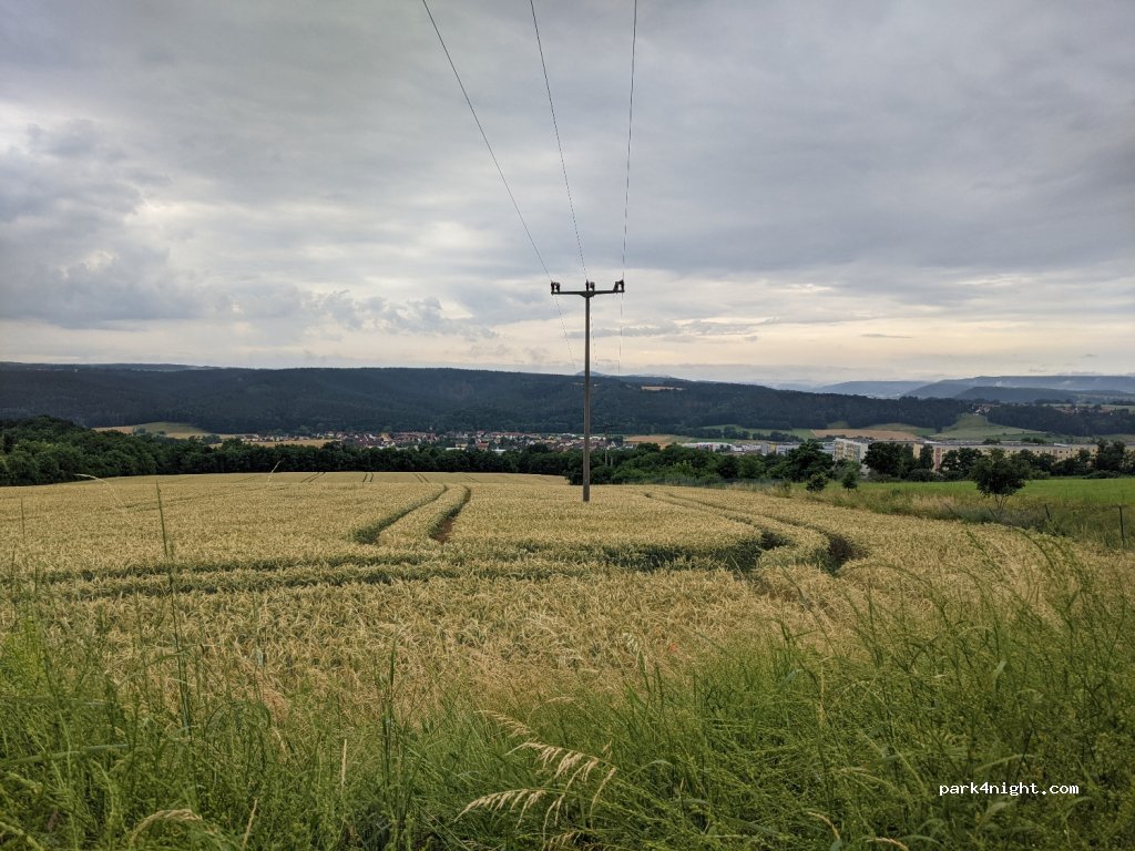 Wunderschöne Aussicht und sehr gemütlich. hinten ist ein Tor, welches vom Besitzer passiert wurde, er störte sich nicht an uns. hinter den Büschen sind Gärten und Häuser. die wenig befahrene Straße hört man von dort, wenn man ein offenes Fenster hat. früh morgens kamen zwei Sprinter vorbei und hielten kurz an, fuhren dann aber wieder.