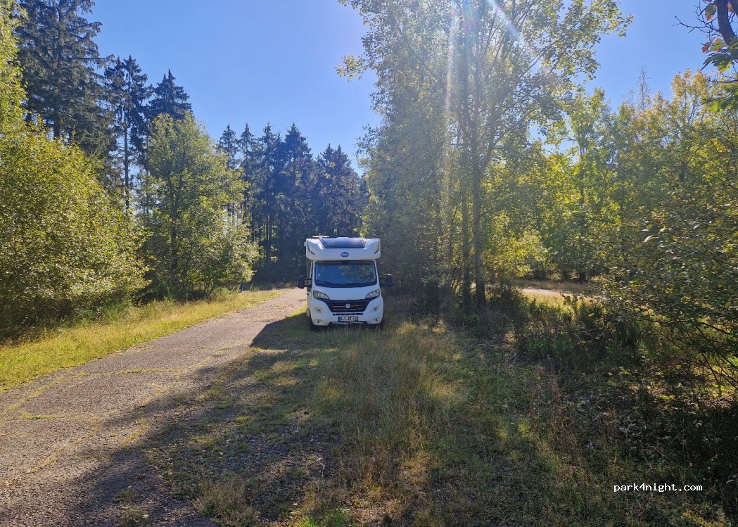 Wir standen ganz alleine auf dem riesen Parkplatz. Die Straße hat man kaum gehört und nachts ist fast keiner dort lang gefahren. Man blickt sehr entspannend in den Wald und morgens wurden wir mit einem tollen Sonnenaufgang begrüßt. Bitte weiter sauber halten.