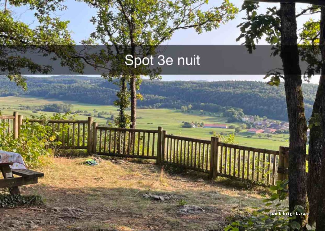Superbe spot, quasi plat. Place pour 2 à 3 vans. Table de pic-nic et très belle vue. Coucher de soleil derrière les sapins donc caché mais très joli quand même. Extrêmement calme (sauf les clichés des vaches). 2 à 3 voitures passées sur la fin de journée et 2 randonneurs. Dans la forêt, possibilité de cabanes pour les enfants.