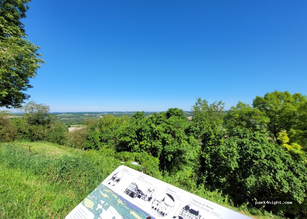 Un parking très agréable se trouve sur le long labyrinthe qui fait le tour du village surélevé de Monflanquin. Le nom de la route sur la carte est Tour De Ville. Vous pouvez choisir de dormir la nuit ou de vous déplacer vers un parking à proximité. Nous avons passé la nuit. Cette route fait partie d'une ligne de bus, donc l'accès est facile. Les vues sont superbes.