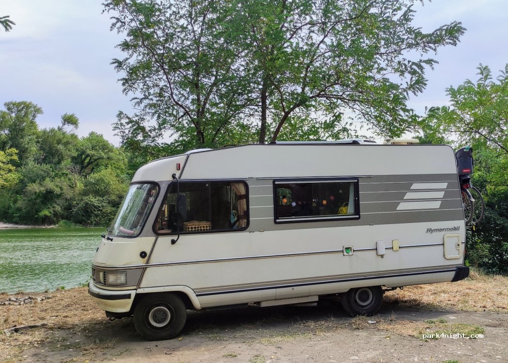 Emplacement sur l'herbe au bord d'un étang proche du Rhône. Arriver par le chemin du Bac à Traille (ch des Biasses étroit et bordé de ronces).