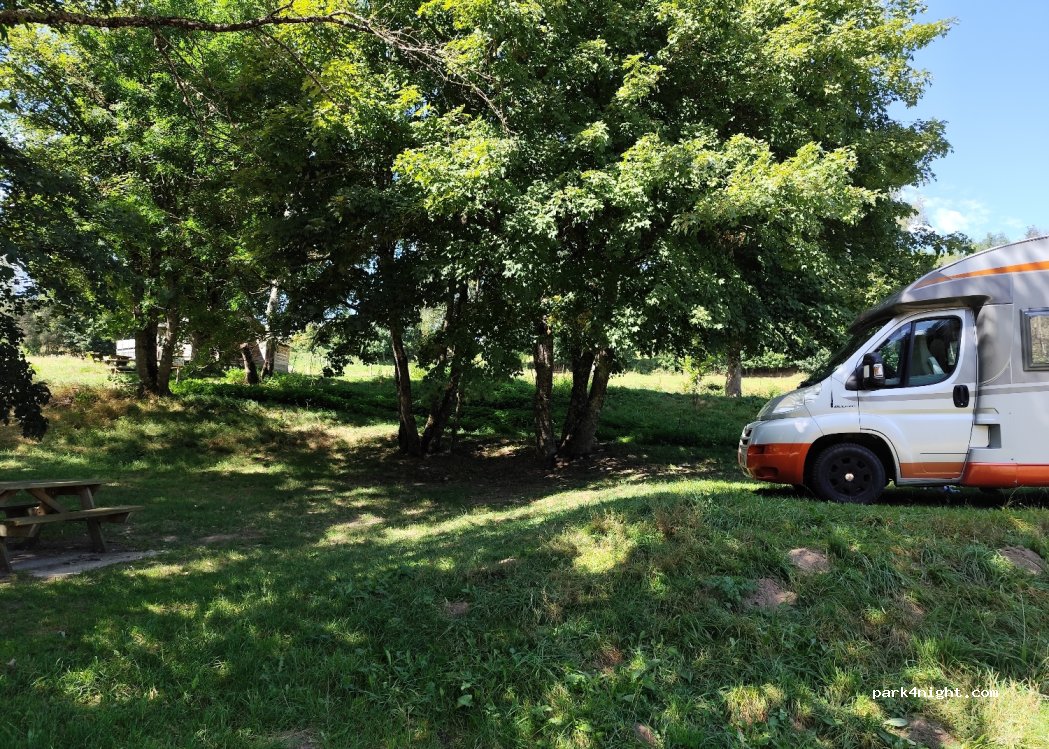 Du monde en journée pour la baignade, quelques pêcheurs en début et fin de journée, super calme la nuit. A proximité (100m?) d’une bâtisse mais pas en vis à vis directe. Par contre 2 coqs, donc concours de cris le matin, à celui qui aura la plus grosse voix! Rivière toute proche, terrain plat, de la place pour plusieurs. Route étroite pour les grands blancs mais parfait en van.