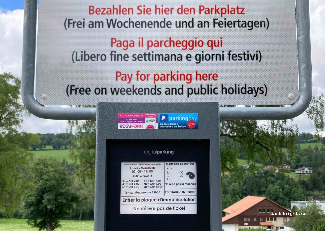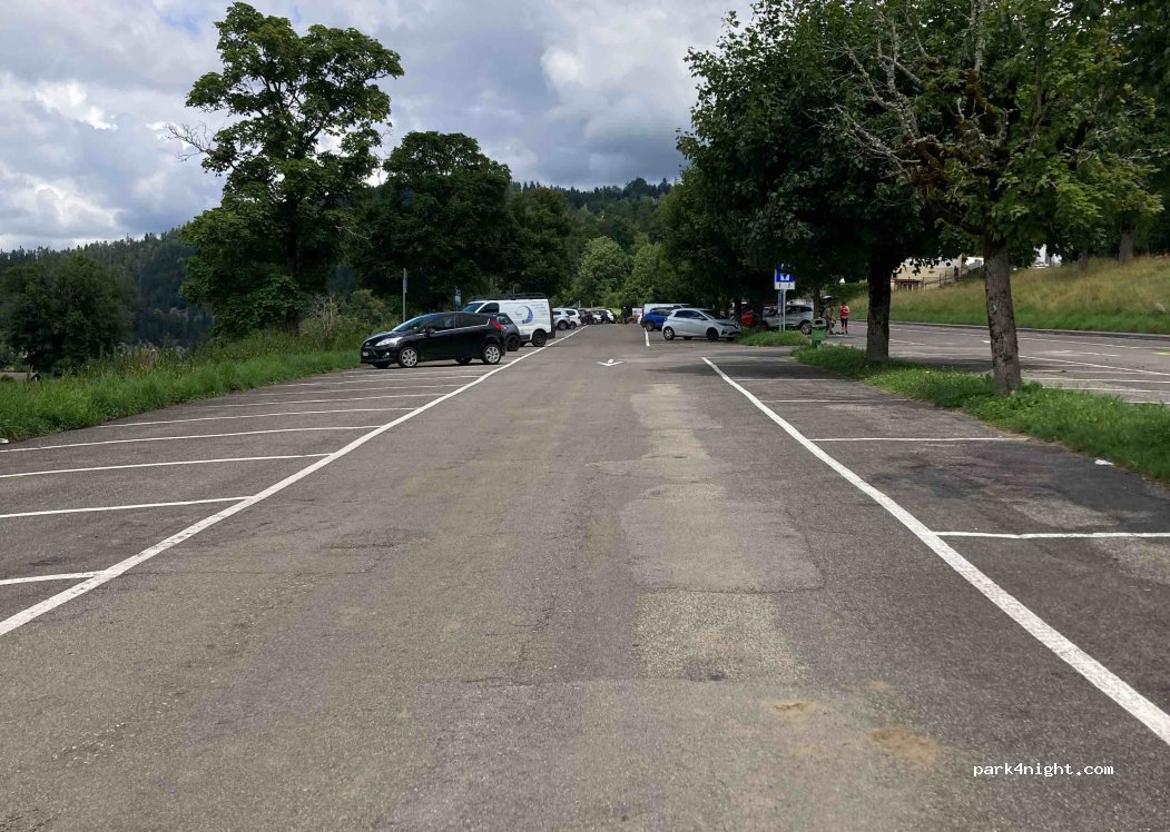 Parken am See, Nacht verboten, aber ideal für den Besuch des Doubs Jumps. Parken für 2Std. kostenlos mit Parkscheibe möglich oder kostenlos am Wochenende & Feiertagen. Weitere Gebühren siehe Foto.