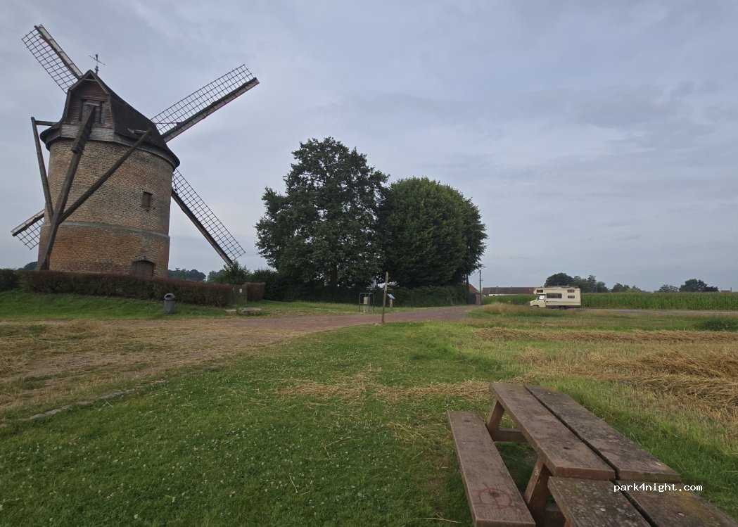 Un super spot, au calme, au plat, avec chouette paysage, à côté d’un très imposant moulin. Aucun service mais la nature! A 15 mn à pied de la gare pour prendre un train pour le centre de Lille! Nous avons rencontré le maire et les élus, tous très charmants! Merci pour ce bel endroit !