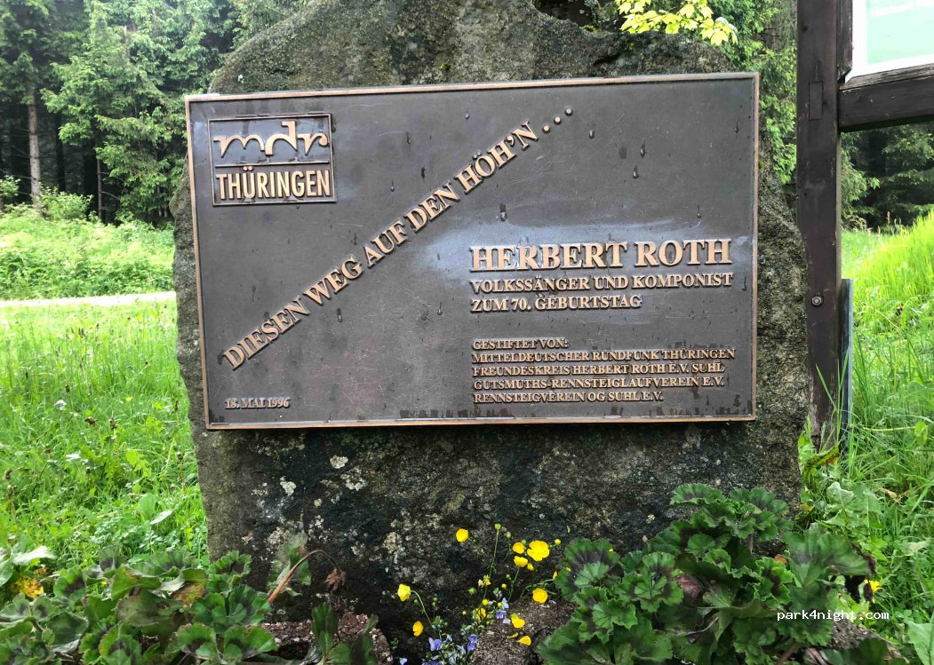 Ein toller,sonniger ebener Platz, die windgeschützte Rennsteigwanderhütte ist wunderbar. Nachts haben wir sehr ruhig geschlafen. Und am Morgen das Frühstück in der Sonne auf den Bänken genießen können. Keine Entsorgung möglich, am Rennsteig nimmt JEDER Wanderer seinen Müll bitte wieder mit mit. Ein Gedenkstein ist Herbert Roth gewidmet, welcher die Melodie zum Bekannten Rennsteiglied komponierte.