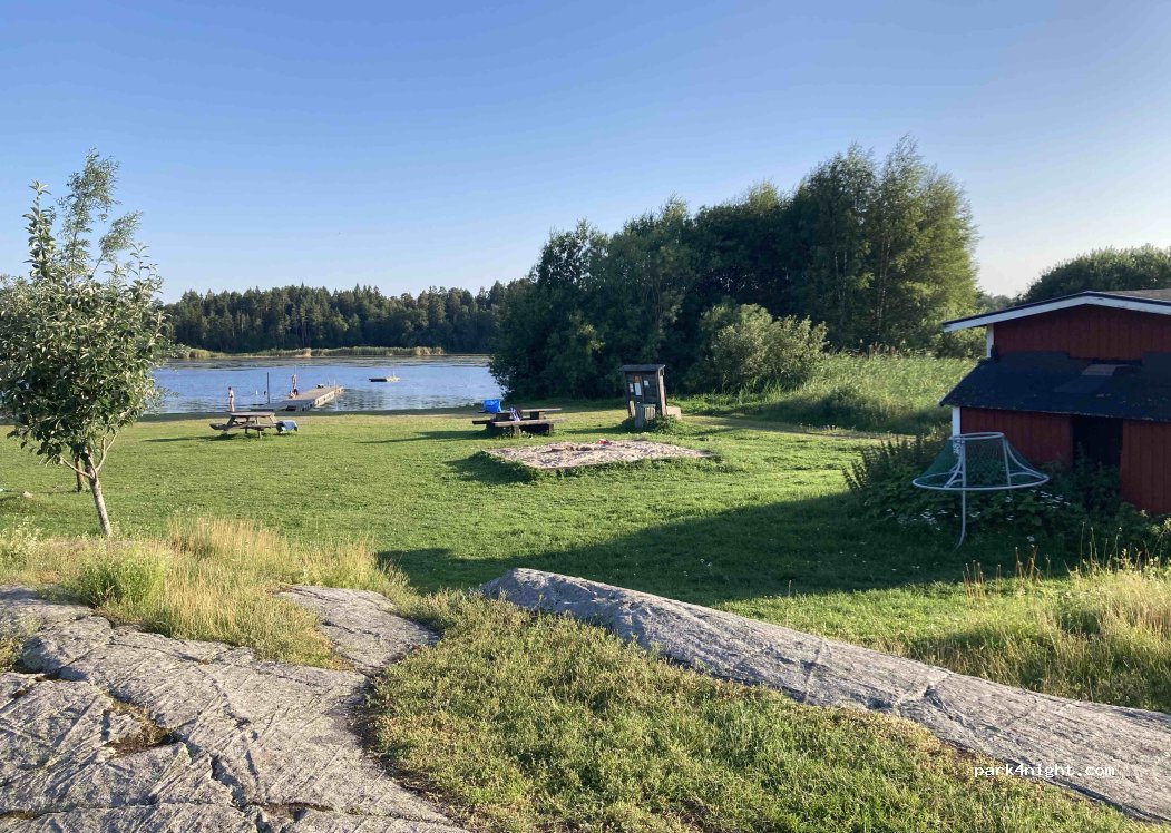 Swimming place. Nice grassareas for sunbath. Drytoilet. Dustbin. Floating bridge for bath. When we were hear in beginning of June the water was brown and did not smell so good. Also much remains from seabirds on the shore.