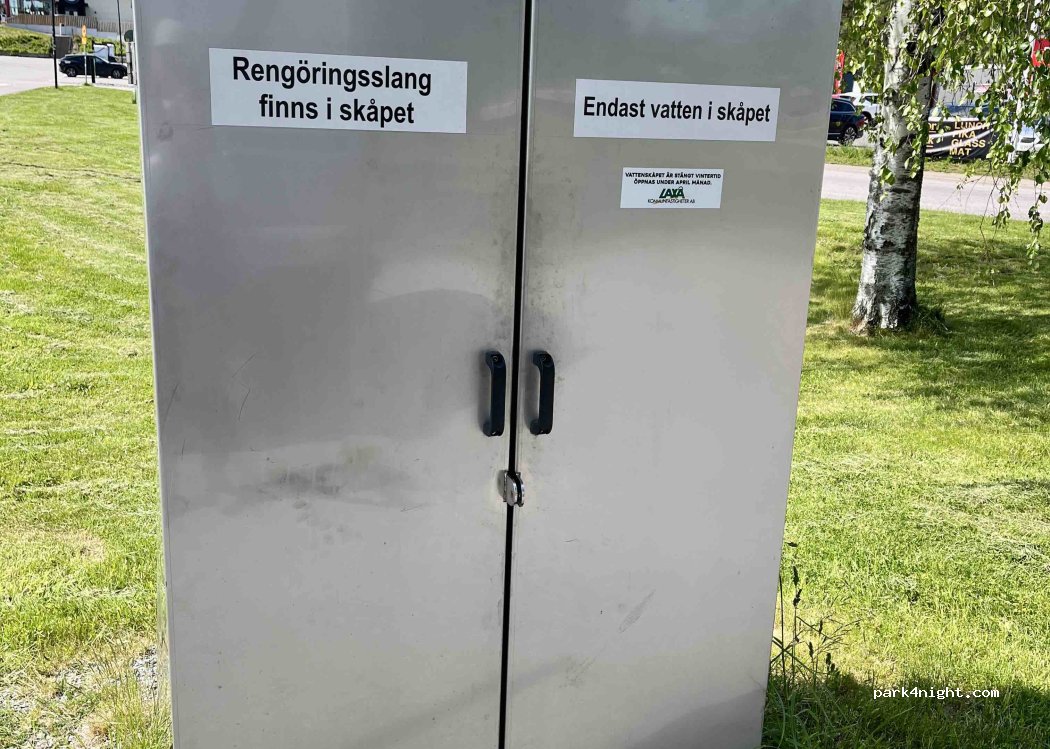 Ver- und Entsorgung, Frischwasser und Grauwasser. Frischwasser nur am Wasserhahn im Schrank, z.Zt. kein Schlauchanschluss möglich. Der graue Schlauch ist zum sauberspülen nach der Entleerung des Grauwassers. Bereitgestellt durch die Kommune Laxå. Aus dem Osten kommend einfach auf dem Parkplatz vom Rastpunkt Laxå abbiegen, gleich rechts Richtung Bowling/ Schule sieht man das Abflussgitter. In der kalten Jahreszeit geschlossen.
