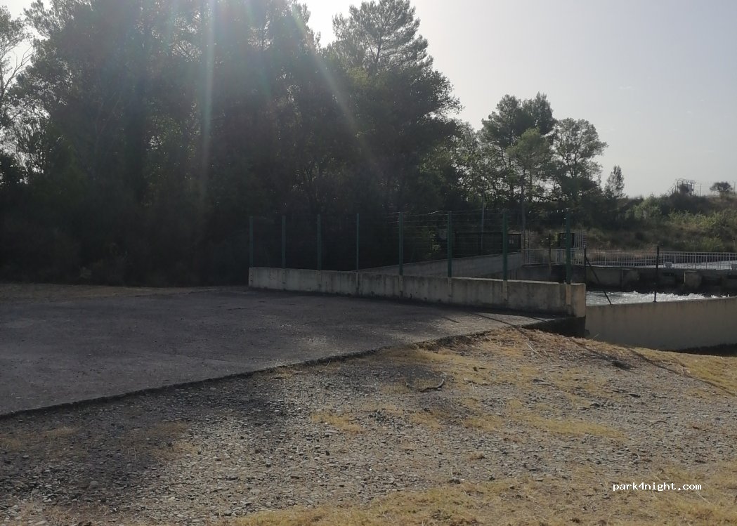 Stationnement accessible par un chemin avec des bosses praticables pour un fourgon, juste à côté d'un barrage la vue n'est pas bucolique mais on est au calme et nous avons plus été dérangés par le chant intense d'un rossignol tout proche, que par le bruit de l'eau !