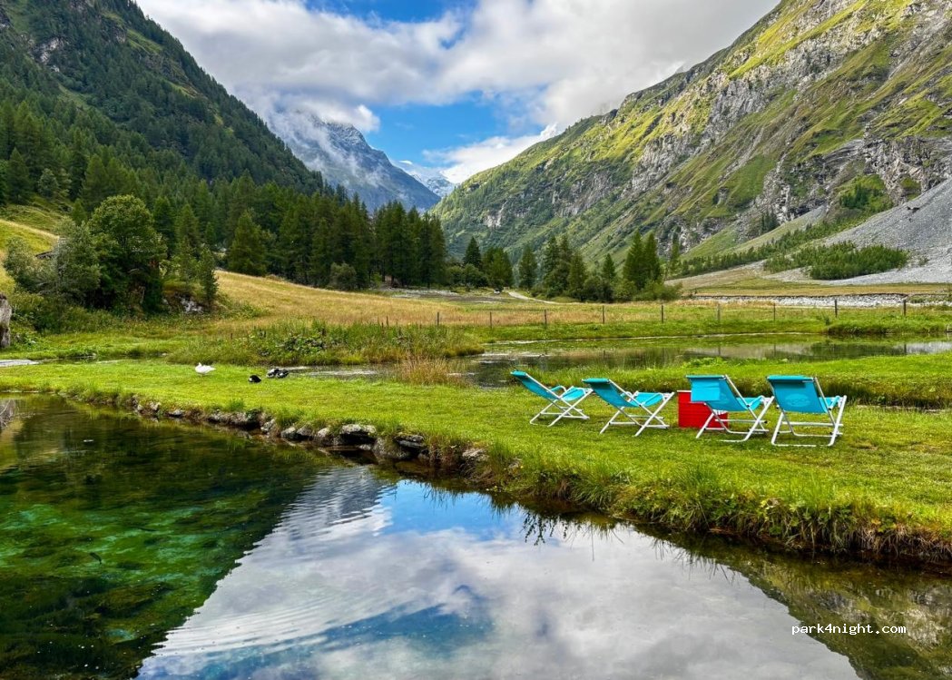 Small campsite at the end of Zinal. Extra welcome. Cheaper than parking at the entrance to the village and with extra service (toilets, showers, restaurant and breakfast). Possibility of taking the meal to your table near the tent or van. Lots of animals and games for children, lake, phone charging via USB.