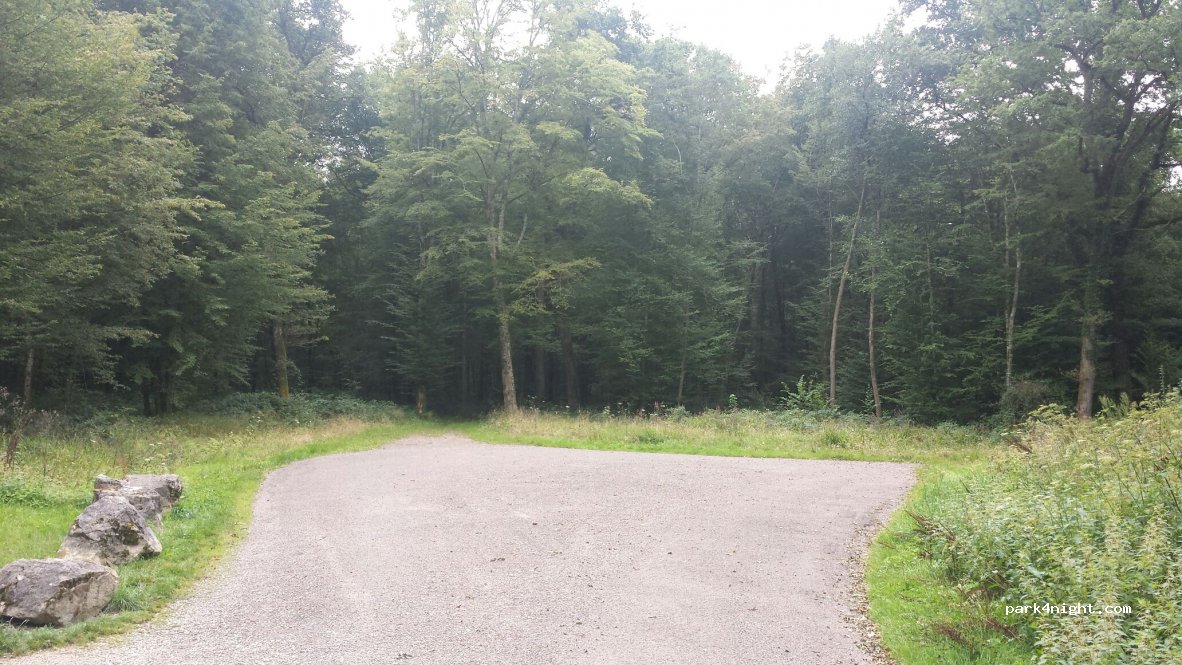 Au milieu des bois, emplacement sauvage sans mention d'interdiction, une clairière en macadam bien tranquille au bout d'une route étroite bitumée. Une bonne nuit calme, idéale pour mes chiens. 3 tables de pique-nique en mauvais état, une source d'eau qui coule fort mais avec la mention "non potable", des départs de chemins et sentiers pour se promener.